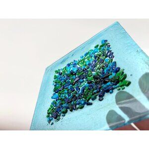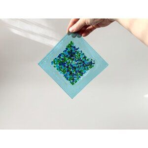 Vintage aqua blue peddle textured square plate. The glass is handblown with a raises pebble texture along the bottom. The plate has some bubbling through which is delibrate. Undated but likely from the 80's. The glass is stunning and quite unique. You could use for jewelry or keys.