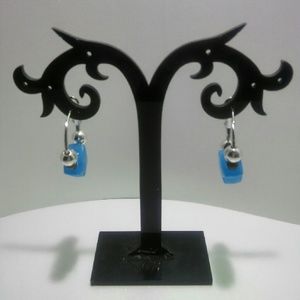 Silver tone 20mm hoops with silver & grey metal ball beads that accent large acrylic aqua blue stars. These beautiful earrings can go from daytime casual to night life party back to daytime for early morning breakfast. The stars will glow in the dark after a short charge in light but step into a night club ladies and you will really get noticed, aqua blue stars are UV and black light responsive.
