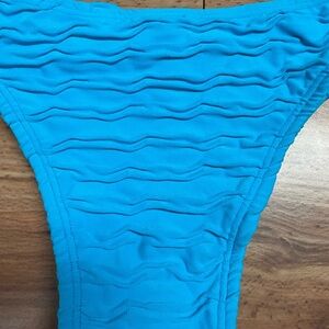 Cheeky bikini bottom with aqua blue textured fabric. Bikini bottom is lined in the front and back.