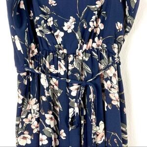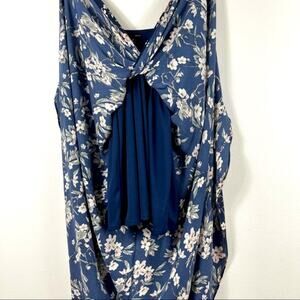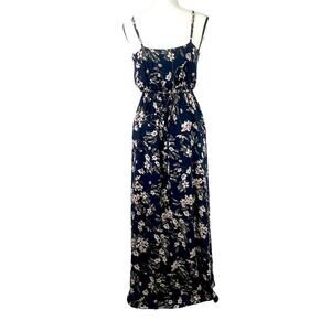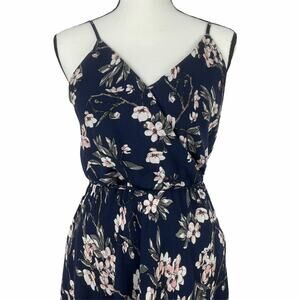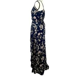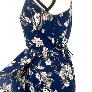 Aqua Navy Blue w/ Pink / Blush Floral V-Neck Faux-Wrap Maxi A-Line Spaghetti Strap Dress - Medium