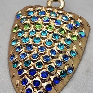 This cute pendant is in excellent condition. Fin is blue green, the rest of the tail has tiny rhinestones that are dark blue, light blue, green and purple. See photos for measurements.