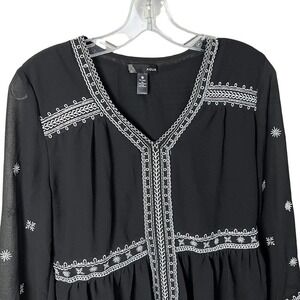 Aqua - Boho Black White Embroidered Long Sheer Sleeve Peasant Top Blouse Small