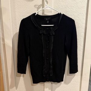 Chic black cardigan with charming bow details. Perfect for layering. Soft and stylish.