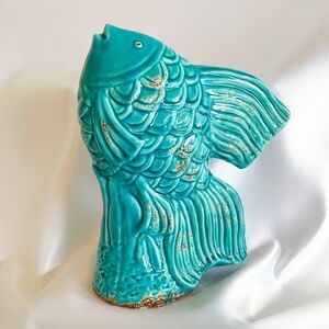 This unique and intricately detailed, Benzara ceramic goldfish will brighten up any space in your home. The perfect coastal décor accent piece is ideal for a beach house, lake cabin or even your outdoor patio.The distressed turquoise glaze finish and fine texture add dimension and interest to the piece. You might even be consider it to have a Japanese Koi influence. Excellent pre-owned condition with minor crazing but doesn’t detract from its beauty. Approximately 11”h x 9”w. Smoke-free, Pet-free home.