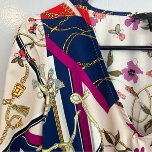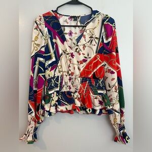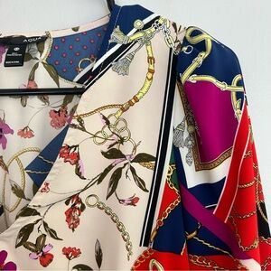 Aqua Chain Print Multi Color Floral Mixed Print Smocked Peplum Top Size XS