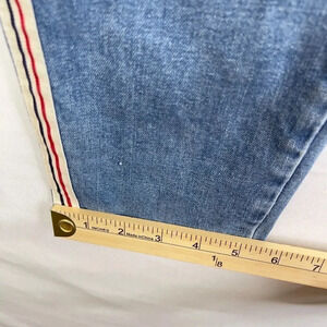 Aqua Denim Jeans with Red, White and Blue Stripes Down Each Side.