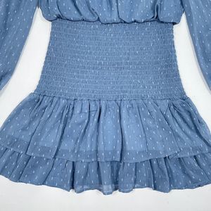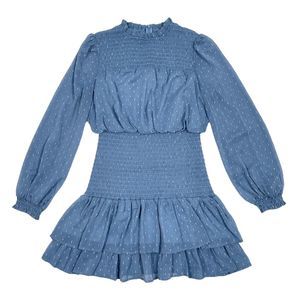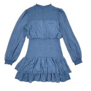 Aqua Dress Medium Blue Metallic Smocked Mock Neck Tiered Long Sleeve Fit Flare
