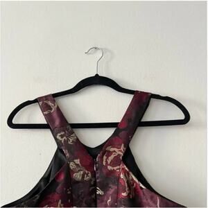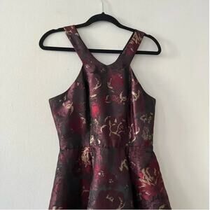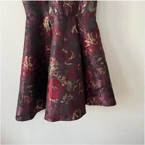 Burgundy, red, and gold floral jacquard fabric. In good preowned condition. Lined.