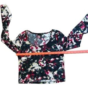Aqua long sleeve crop top, women’s size medium, multicolor abstract floral print in red, pink, green, and black, scoop neckline, slim fit silhouette, stretchy fabric blend (93% polyester, 7% spandex), lightweight and comfortable, cropped length perfect for layering or pairing with high-waisted jeans and skirts, modern and trendy style, versatile for casual wear, going out, or streetwear looks, measurements shown in photos, in excellent pre-owned condition, floral core, y2k core, streetwear core, casual core