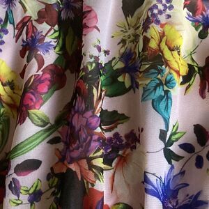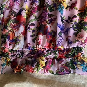Aqua, Bloomingdales private label, girls floral print boudin blouse with elasticized scoop neck, smocked waist with ruffle at hem, modified blouson style and long sheer sleeves with smocked cuffs. Fully lined. 100 polyester. Machine wash. Size Large (12-14). Excellent condition. Matching skirt available under separate listing.