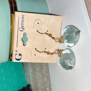 Goldtone fish hook wire earrings with white pearls and aquamarine colored Murano Glass hearts.