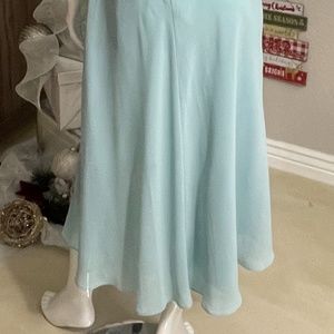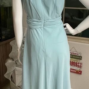 (Like New) This gorgeous 3/4 length free flowing Stephanie Charles Gown is stunning for any occasion. Its low cut front with criss crossed pattern that wraps around the waist is elegant and will compliment any body type. It is 100% Polyester with zpper up the back. Displayed on 5'7" mannequin.