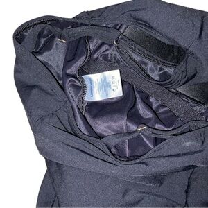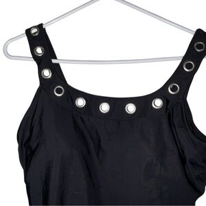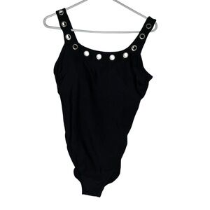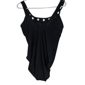 This sophisticated one-piece swimsuit by Aqua Green features a classic black color with adjustable shoulder straps adorned with metallic studs. The gathered bodice creates an elegant draping effect, offering both style and good coverage.