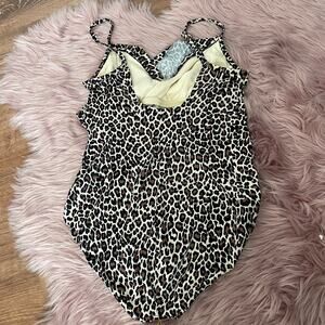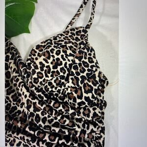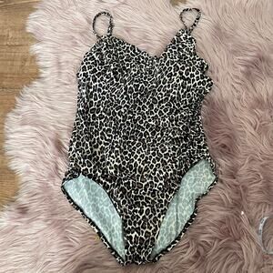 EUC is a one piece swimsuit by Aqua Green. This is done in a brown and black leopard animal print. Built in shelf bra. Adjustable straps. Full coverage on bottom. 89% nylon 20% spandex. UPF 50
