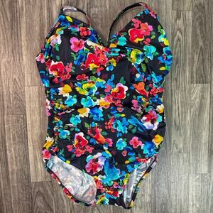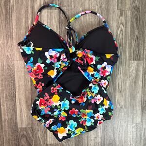 Aqua Green Floral One Piece Swimsuit XL Black Multicolor Ruched Cut-Out Back