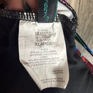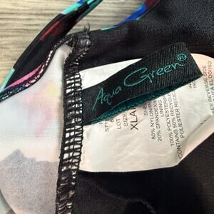 Beautiful Aqua Green one-piece swimsuit in XL (label shows “XLarge”) with a vibrant floral print on a black base. Features ruched panels for flattering shape, adjustable straps, cut-out back detail, and full lining. Shell is 80% nylon 20% spandex, lining 100% polyester (50% recycled). Made in Indonesia per label.