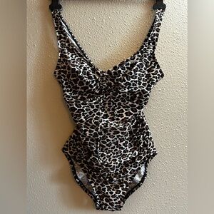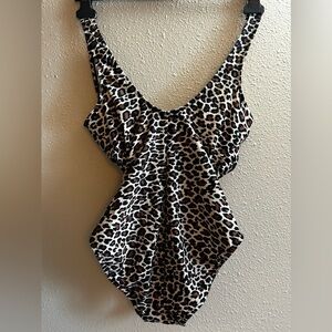Stylish leopard print one-piece swimsuit. Perfect for a bold beach look.