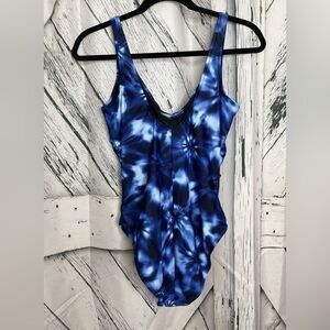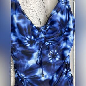 One piece blue and white tie-dye swimsuit. Ruched in front