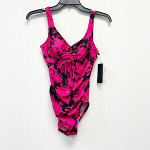 Stylish one-piece swimsuit with a vibrant pink floral print on a black background, designed for a flattering fit and comfort.