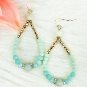 Vibrant aqua green beaded teardrop hoop earrings with gold accents, perfect for bohemian or western-themed outfits. These lightweight earrings are fashioned with faceted beads and semi-precious stones for versatile styling. - Fabric: Semi-precious stone, faceted beads - Dimensions: 2.75" length, 2.5" drop - Fit: Lightweight, comfortable wear - Condition: New, clean, odor & smoke-free - Features: Goldtone accents, fish hook style - Care: Store in a cool, dry place, wipe clean with soft cloth #goldaccentedearrings #bohostyleearrings #summerjewelry #beadedhoopearrings #teardropdesignearrings #lightweightstatementearrings #hoopearrings #beadedearrings #teardropearrings