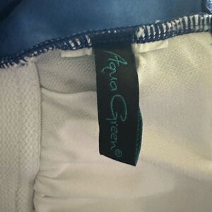 Aqua Green tie dye, one piece, ruched, modest swimsuit. In good, used condition. Approximately 13 inches from armpit to armpit, 12 inches across the waist (which has plenty of stretch, with being elastic), and 26 inches long. No size tag! In good, used condition. From a pet and smoke free house.