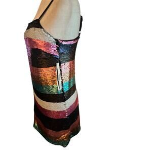 Aqua Luxe, designed exclusively for Bloomingdale's. Gorgeous sequined mini dress with adjustable spaghetti straps. Dress has a black liner. New with tags, retail price $118. Size small. 100% polyester. Please note approximate measurements below.