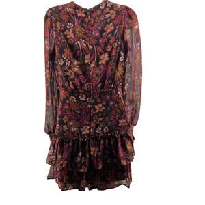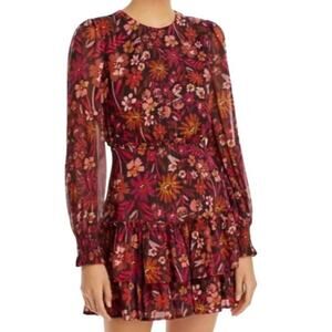 Aqua Metallic Floral Print Mini Dress Long Sleeve Ruffled Womens Size Small