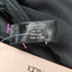 Black.  Ruched, gathered detail along the center of the front and back of the dress.  Adjustable spaghetti straps.  Ruffle hem.  Fully lined.  New condition -- no flaws. Laid flat pit-to-pit: 16in. Laid flat waist: 12in. Bottom of strap to hem: 26in.