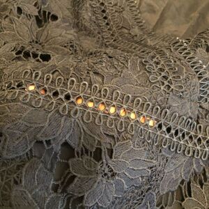 Darling flirty, coquette lace dress with a mini length and flippy skirt. The perfect option for date night or cocktail parties. There is a bit of wear, or shine on the trim at neckline. Please see photo. Otherwise, in like new condition.