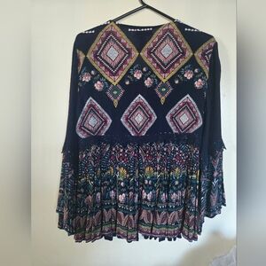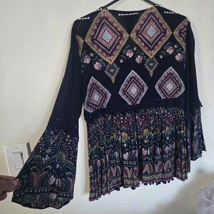 Aqua Navy and Colorful Embroidered Boho Blouse Skze XS