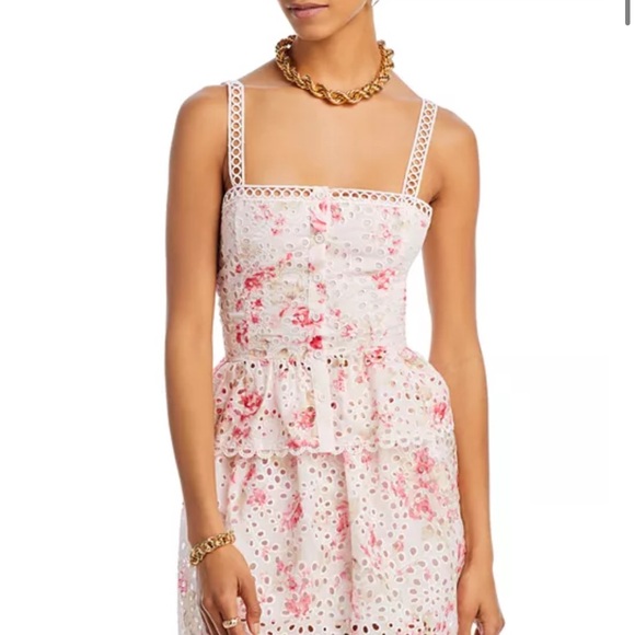 Charming pink floral midi dress by Aqua. Features intricate eyelet details and a flattering silhouette. Ideal for special occasions.