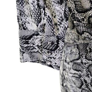 Adorable python print dress that will make a statement at any party! Puff sleeves, v-neckline and ruching down one side of the skirt. Back zipper closure and button closure at the wrists.
