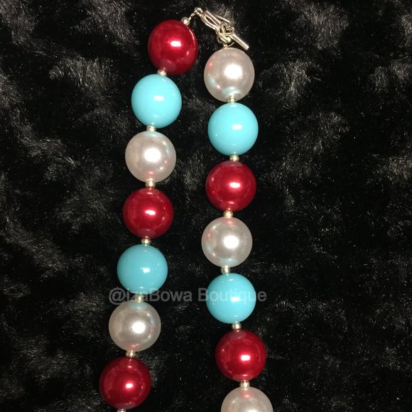 Girls Boutique, izaBowa Boutique, Handmade, Chunky Bead Necklace, Dress up, Princess, Dr Seuss, Blue, Red, White, Cat in the Hat