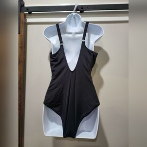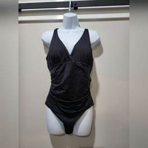 Aqua Regina V Neck One Piece Ruched Tummy Control Bathing Suit NWT size XL Black