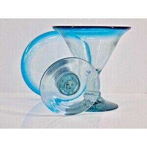 Aqua Rim Thick Hand Blown Margarita Martini Glasses Set of 2 Mint Condition