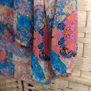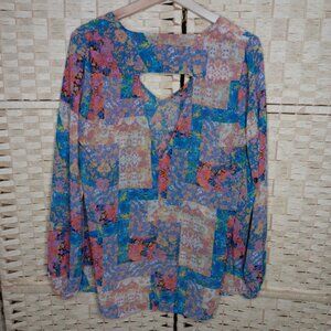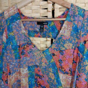 Aqua Sheer Patchwork Print Hi Low Sheer Long Sleeve Blouse Medium