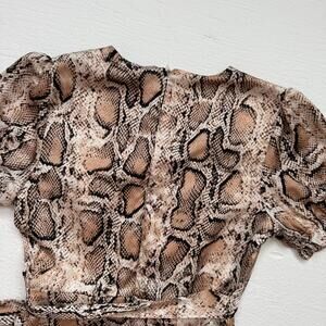 this aqua mini dress features a chic snake print in tan and black with a flattering wrap style silhouette. designed with puff sleeves, a ruffle hem, and a waist tie for definition. the satin-like fabric and full lining give it a luxe feel, making it perfect for nights out, parties, or statement styling.