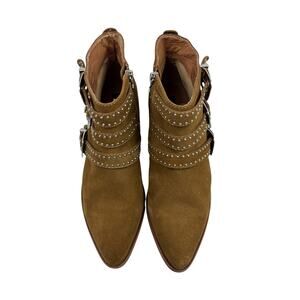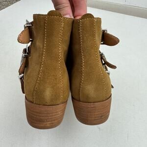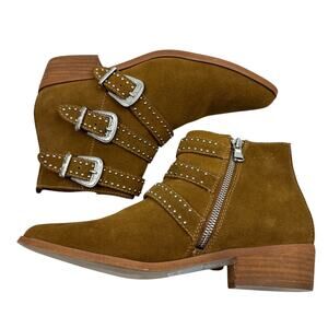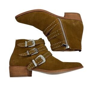 Brown suede, silver-tone hardware, side zip closure, size 8.