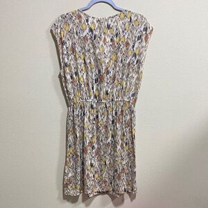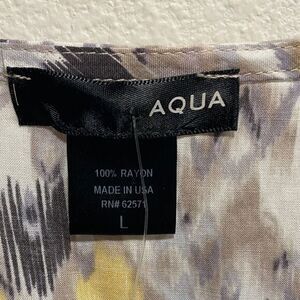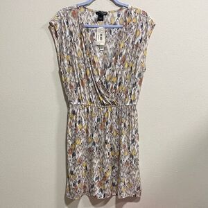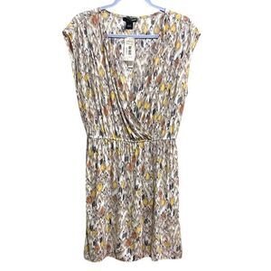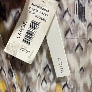 New with tags Aqua surplice-front dress featuring a neutral “Stonem” abstract ikat print with mustard, orange, and black accents. Lightweight rayon with a flattering draped fit and elastic waist.