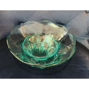 Beautiful vintage aqua/teal pressed glass bowl set featuring a scalloped rim and striking 10-point starburst base. This mid-century style is classic to 1940s–1960s American glassmakers such as Anchor Hocking, Hazel Atlas, and Jeannette.