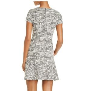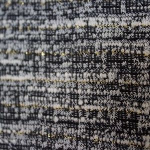 Dress is dry clean only. Material has a tweed texture. Color is White and light grey with gold metallic thread weaved through.
