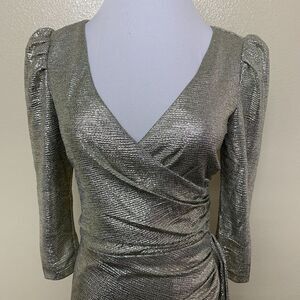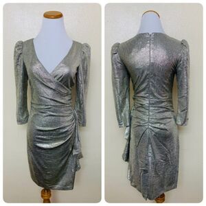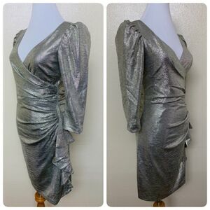 Aqua Womens Bloomingdale Ruffled Mini Plunging Dress Size 4 Metallic Silver $238
