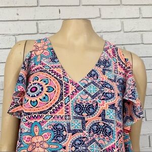 Aqua Women’s Neo Geo Print Top. A gently used charming print top that’s summer and vacation vibe friendly. Polyester.