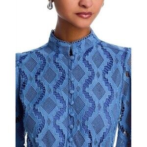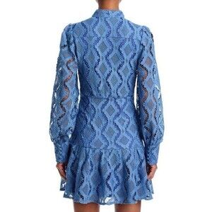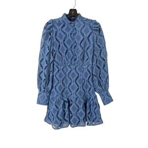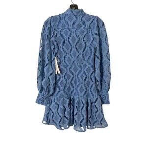 The Aqua Women's Wavy Lace Blue Mini Dress in size XS is a stylish and trendy piece perfect for parties or casual occasions. Made from polyester with a lace fabric type, this short dress features long sleeves and ruffle accents, adding a touch of femininity to the design.
