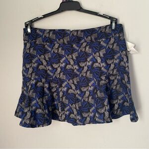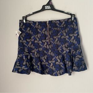 Blue and black floral. 100% Polyester. Zipper closing on the back.