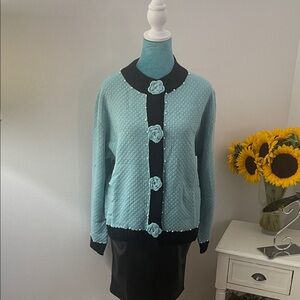 This super cute aqua knit snap up sweater has flowers and pearls throughout and is size XL. Measures 21’ from underarm to underarm and 23’ from shoulder to end. Perfect for office or casual. Made of acrylic. New without tags.
