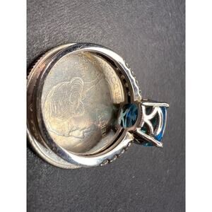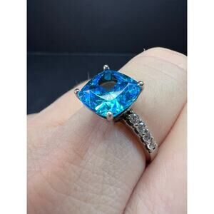 Rich aqua blue square cushion cut cubic zirconia gemstone prong set in an authentic 925 sterling silver setting that’s likely plated with platinum or rhodium. Small white / colorless accent stones on band are also Cz. Blue cz stone measures close to 10mm on all sides. Measures a size 8. Total weight of ring is 3.97 grams. Stamps inside of shank are SW 925. I believe this was a QVC ring. Blue stone glows bright green under UV light. Such a fun bling ring!