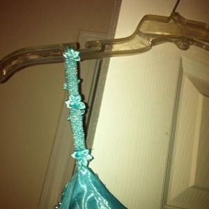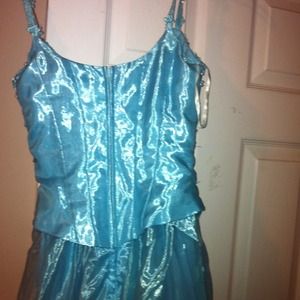 Aqua colored gown with beaded top and straps with small detailed flowers. Can be used for prom, balls, pageants etc. Only worn once.