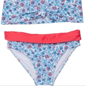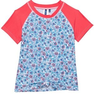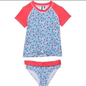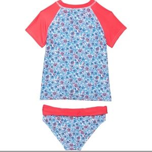 This two-piece swim set includes a short-sleeve rash guard shirt and coordinating bikini brief swim bottoms. The solid color is a pink-ish red color with contrasting white, aqua blue, orange, red and pale peach floral print. The top has a crew neck with raglan sleeves and a bow on the center front hemline. The bottoms have ruched sides that are slightly gathered. The set is brand new with tags.