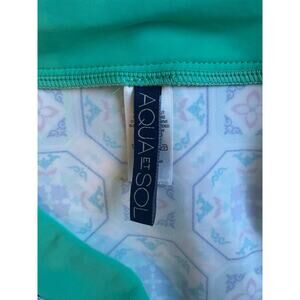 Aqua et Sol swim dress in size medium is a stylish and practical cover-up, perfect for sunny days by the water. Featuring a vibrant geometric pattern in shades of green, this lightweight kaftan-style dress offers both comfort and sun protection. The pullover design with a flattering V-neck and 3/4 sleeves provides effortless wear, while the stretchy nylon-spandex blend ensures a comfortable fit. Ideal for spring and summer, this pre-owned swim dress is in excellent condition and ready for its next adventure.